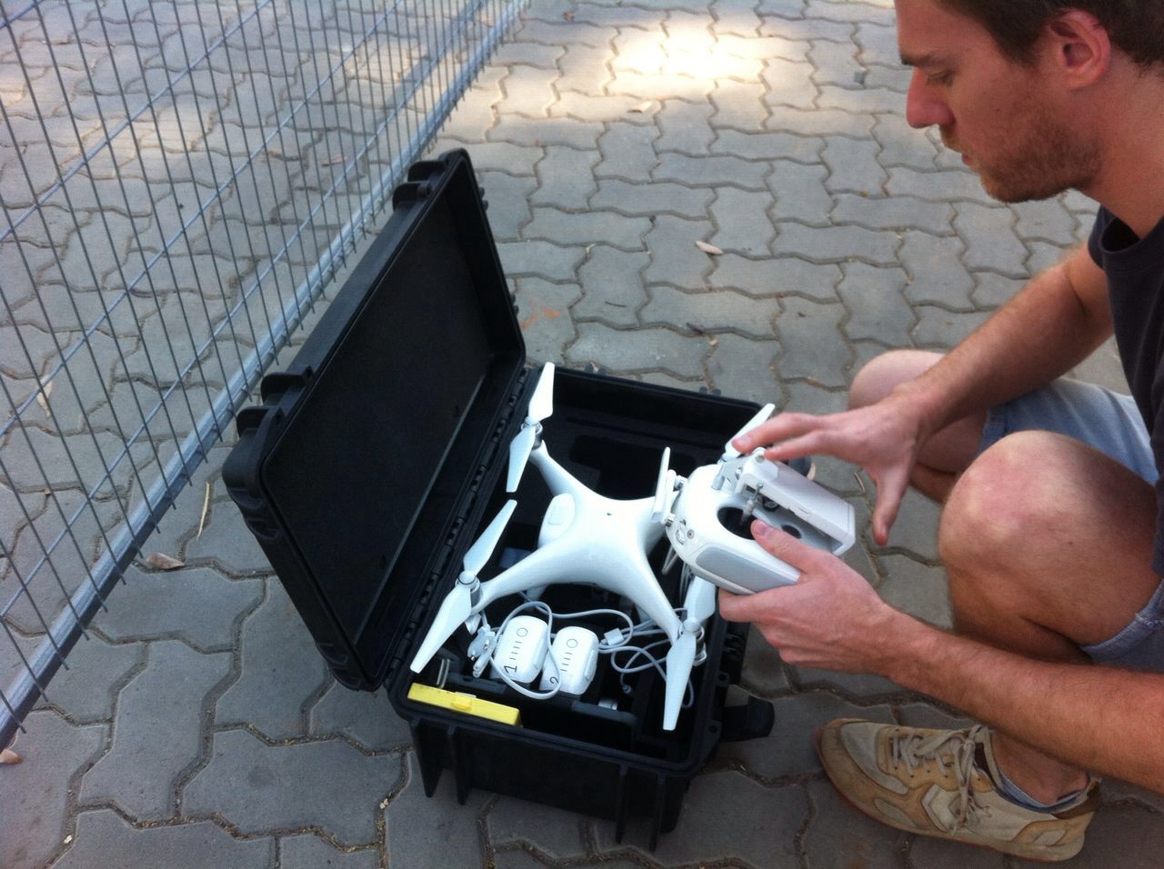 Pour filmer, nous utilisons un drone télécommandé avec caméra intégrée. L'image filmée est retranscrite sur une tablette ou sur un Iphone, en direct, quasi-instantanément. Très récent, ce modèle est sorti il y a seulement 3 mois. Parmi ses atouts : sa taille et sa discrétion. Il mesure une quarantaine de centimètres (ailes inclues) et, vu de loin, il se confond avec un oiseau dans le ciel.