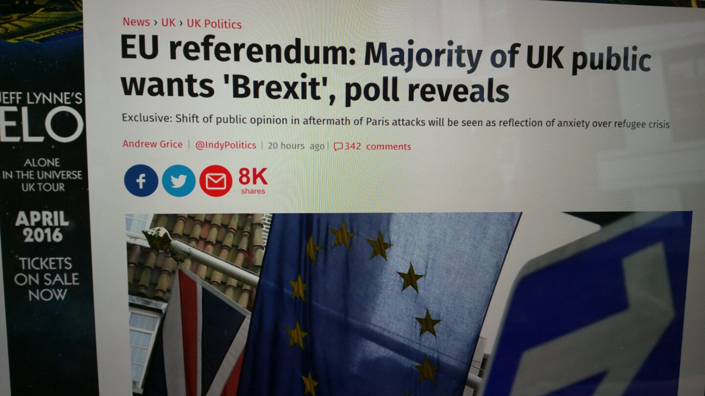 C'est officiel, selon un sondage réalisé par l'institut ORB après les attentats du vendredi 13 novembre à Paris, plus de la moitié des Britanniques souhaitent quitter l'union européenne. Cette enquête publiée mardi par le très sérieux The Independent, montre que 52% des électeurs britanniques optent pour une sortie de la Grande Bretagne contre 48 % qui veulent son maintien au sein de l'union européenne. http://urlz.fr/2K0y