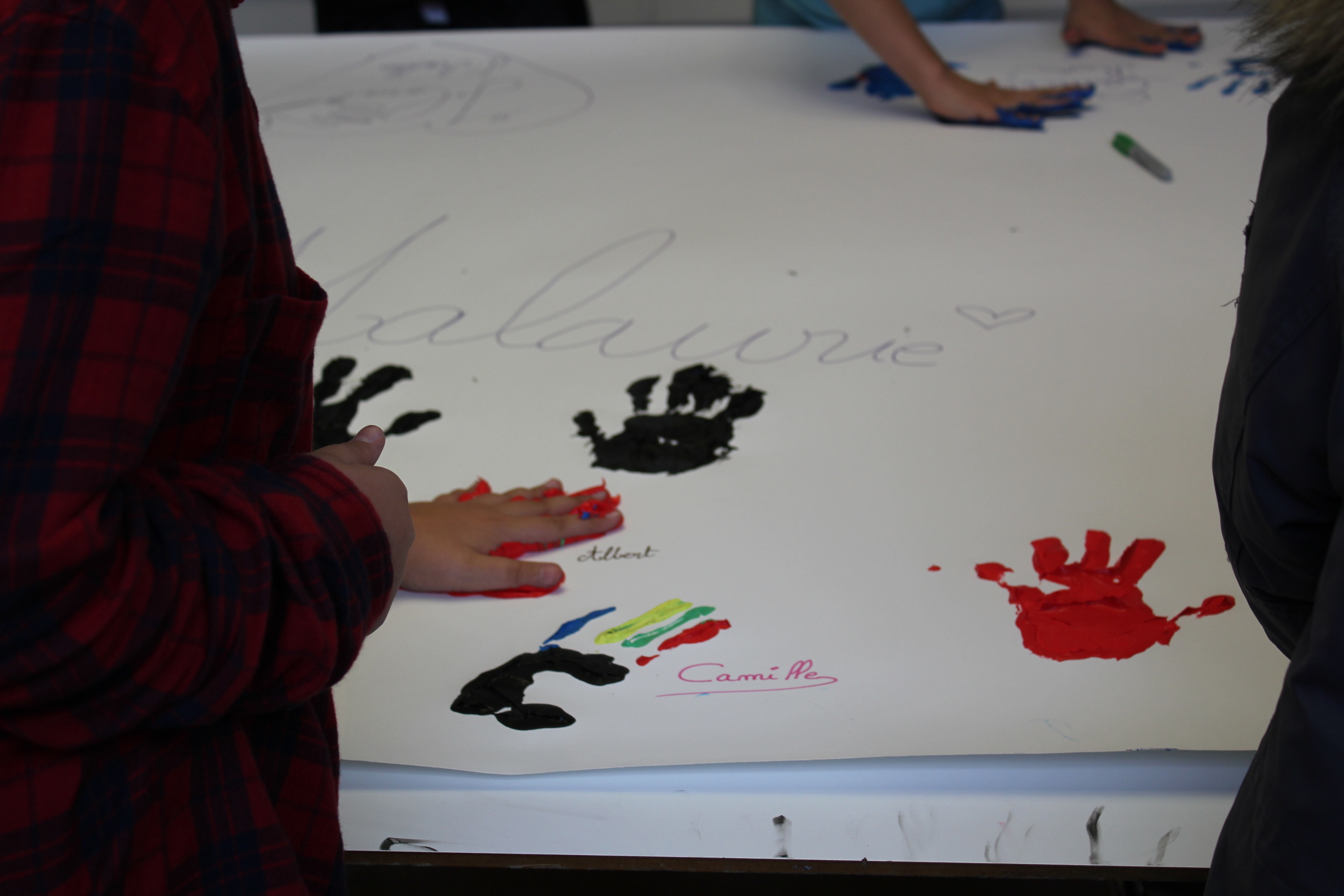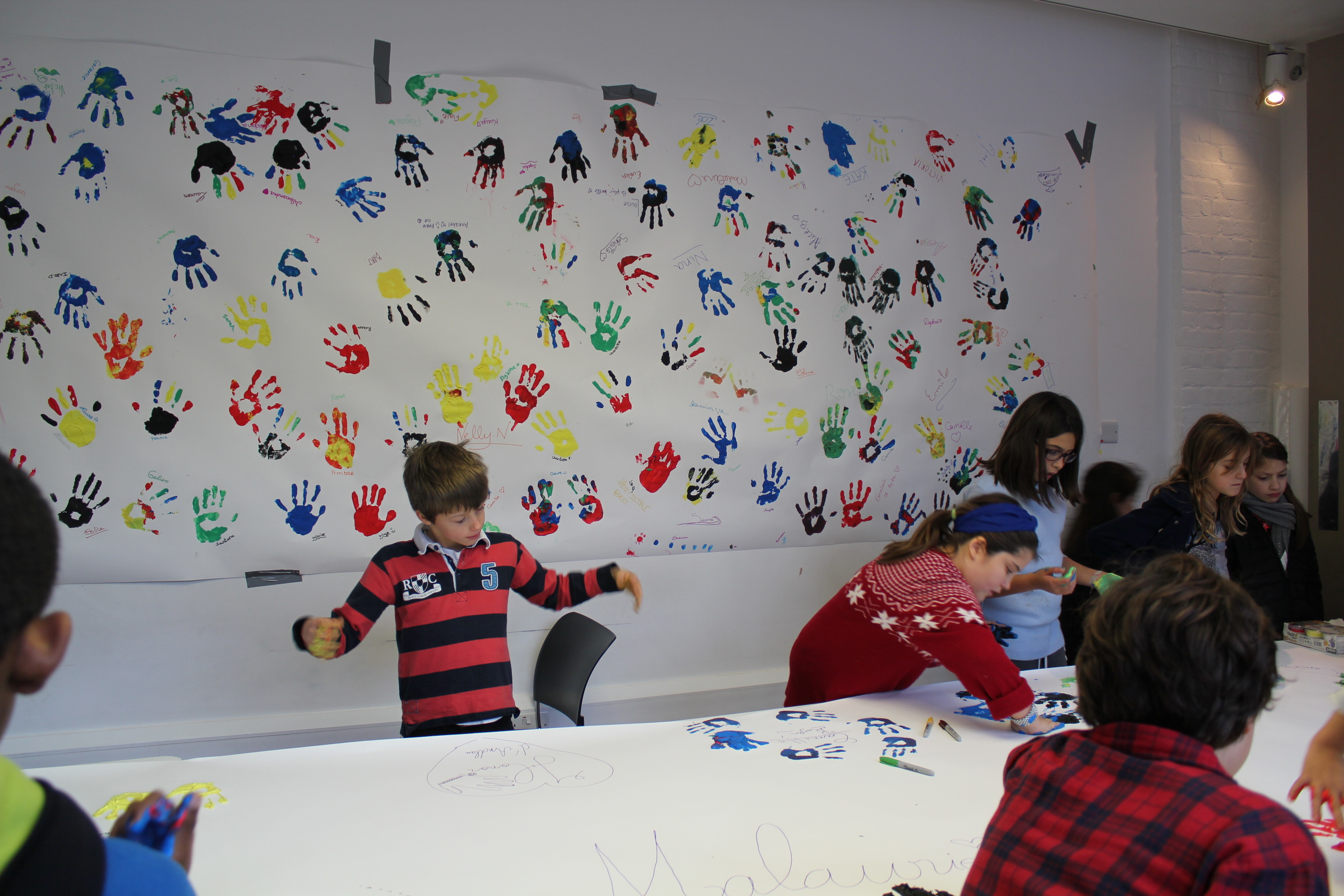 Les petits primaires ont eux aussi apporté leur pierre à l’édifice en ayant créé l’atelier « Frise de main solidaire » où le principe est de montrer leur mobilisation en apposant leur mains imprégnées de peinture sur le mur de la solidarité (chaque petit élève apportait une pièce de 50P).