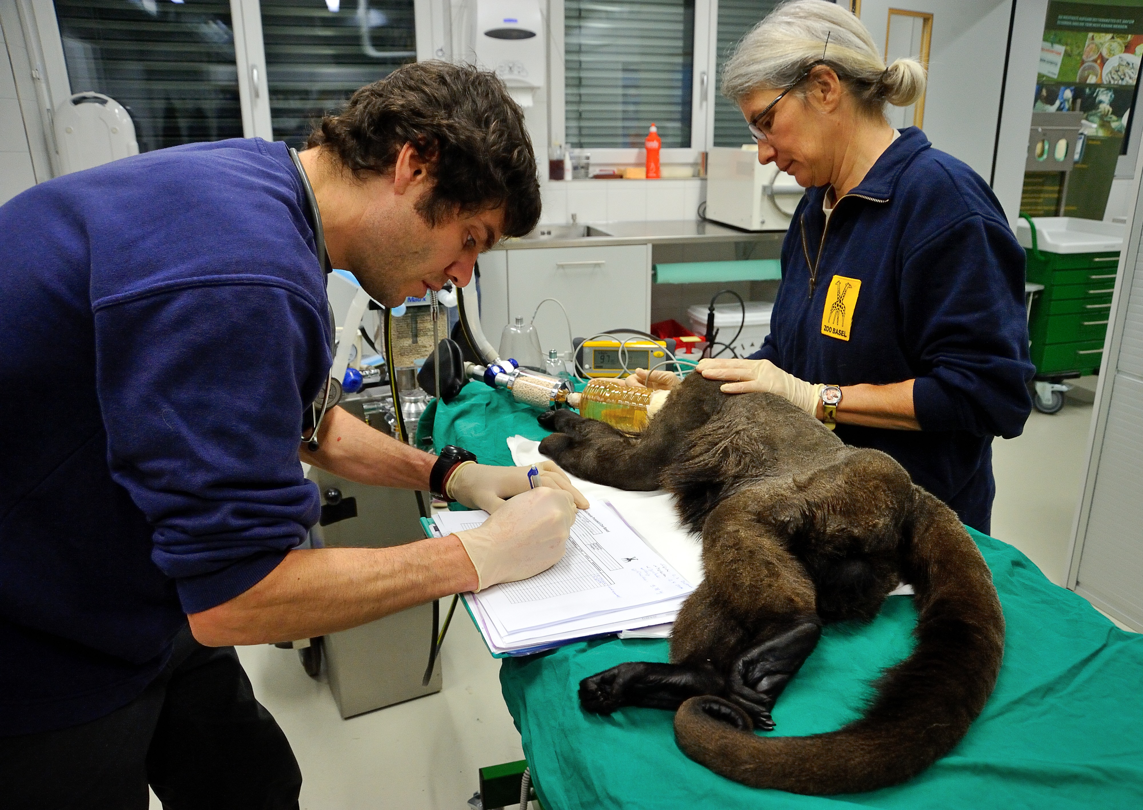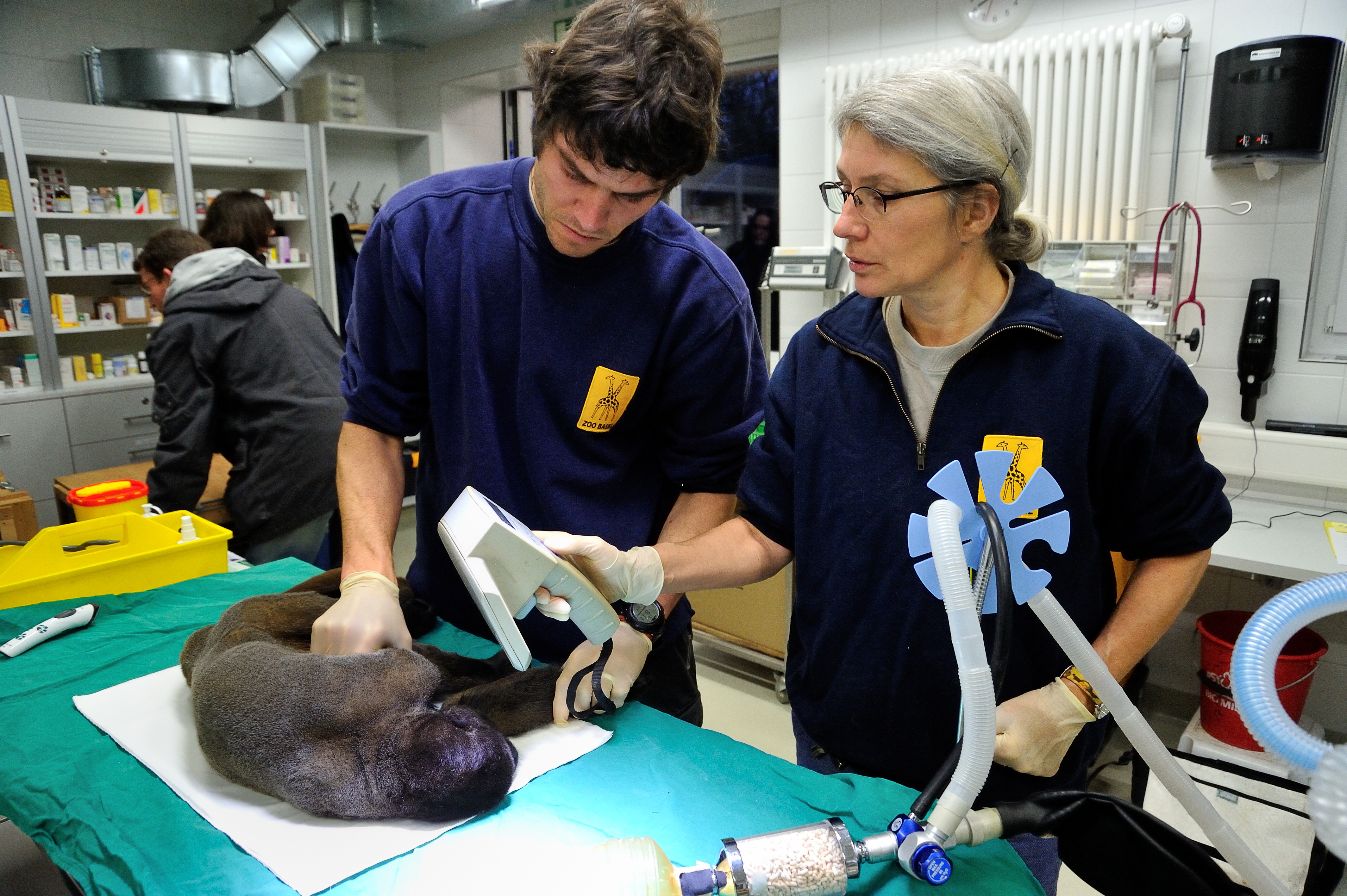 Luca, Molimo et Chorito, les trois singes laineux ont été récupérés au zoo de Bâle le matin même. Pour la mise en boîte de contention, les trois primates ont dû être endormis, l’occasion pour l’équipe vétérinaire de Bâle de faire un check-up médical complet : prise de sang, radiographie, vérification de la dentition, test de tuberculose…