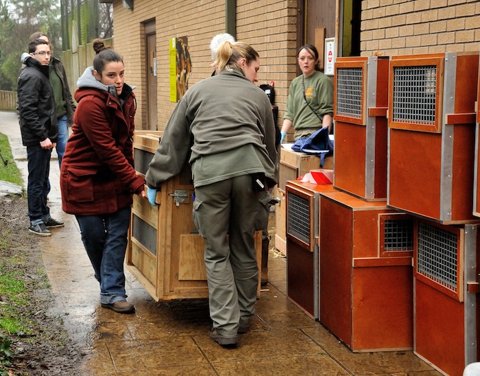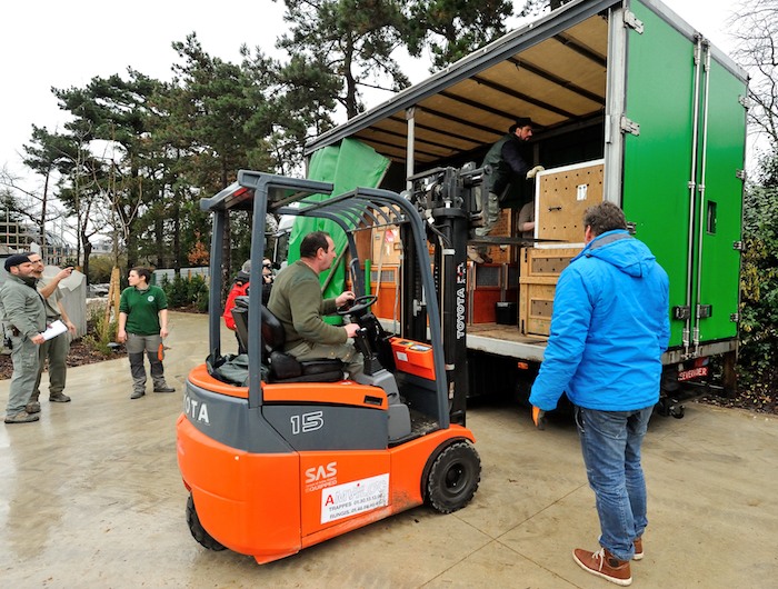 - Les soigneurs donnent un coup de main aux équipes du zoo d’Edimbourg pour manipuler les caisses © F-G Grandin / MNHN