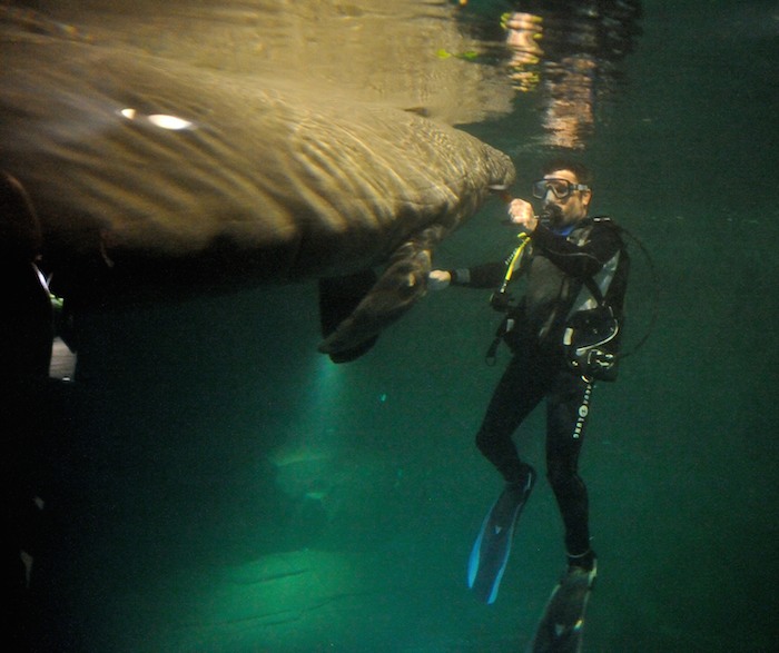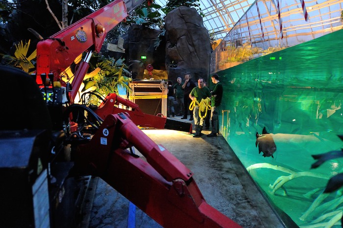 Mardi 26 mars, 15h. L’agitation se fait sentir dans la Grande Serre. Dans quelques minutes un convoi exceptionnel transportant un lamantin en provenance du zoo d’Arnhem aux Pays-Bas pénètrera dans l’enceinte du zoo. En attendant, on s’attelle aux derniers contrôles, on prépare le repas (des caisses entières de salade), on vérifie l’installation de la grue. Car il n’en faut pas moins pour pouvoir mettre l’animal de près de 600 kg à l’eau.
